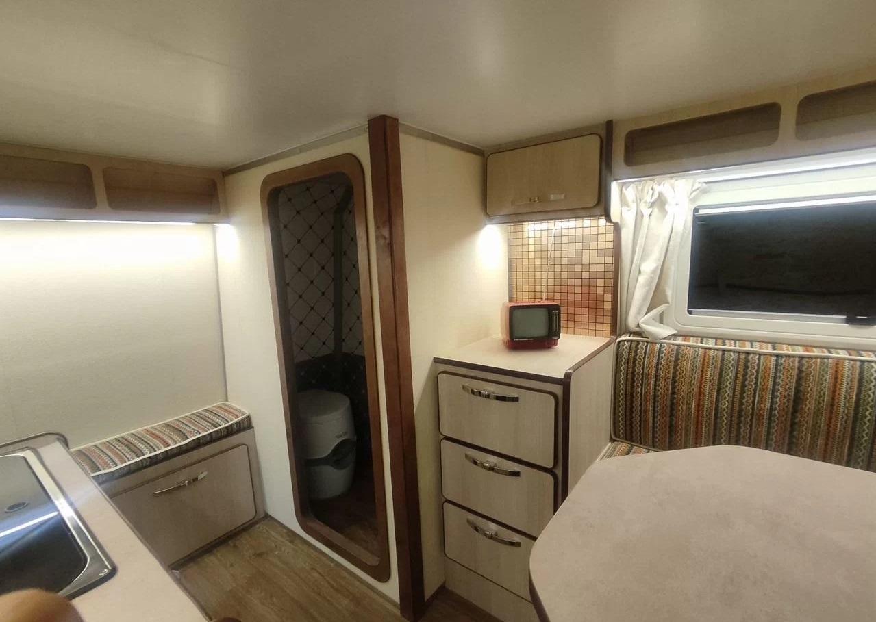 The unusual mobile home is built on the chassis of a 2006 Trofim pickup truck. These trucks were produced in small batches at the Tula Gidroprivod plant and were initially equipped with a cab from the GAZ-3110. The presented example has been seriously modified; in appearance it resembles the classic Volga GAZ-24, which gives it the charm of a retro car.