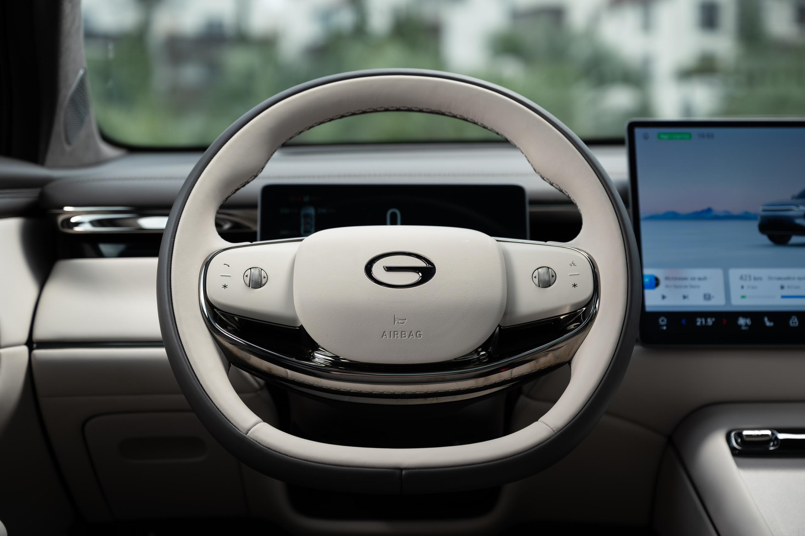 The steering wheel of the GAC S7 is almost oval in shape. Behind it is a compact instrument panel